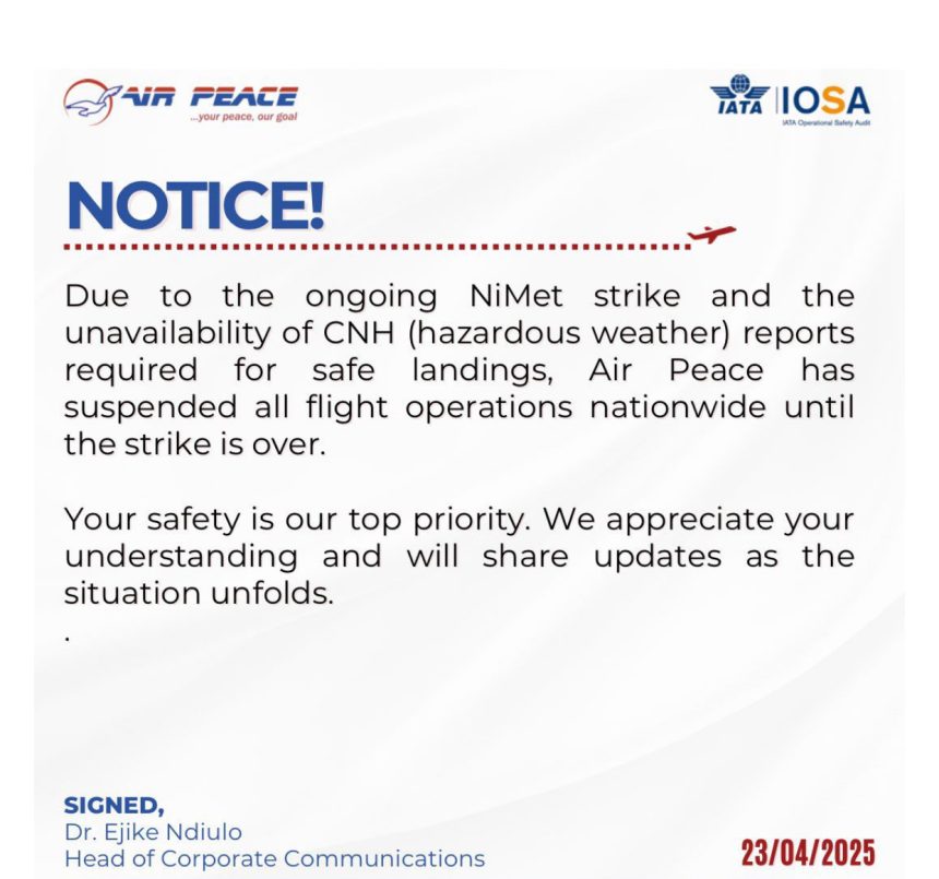 The management of AirPeace has suspended fight operations nationwide following the strike actions of the Nigerian Meteorological Agency, which commenced on Wednesday.