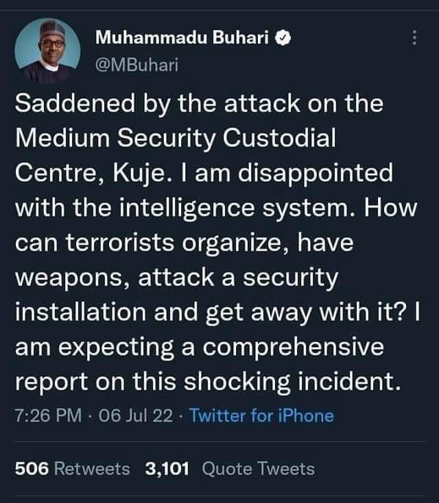 President Muhammadu Buhari has queried the Chief of Army Staff, Major General Farouk Yahaya and the Inspector General of Police, Usman Akali Baba over the collapse of defense and intelligence that led to the attack on Kuje prisons.