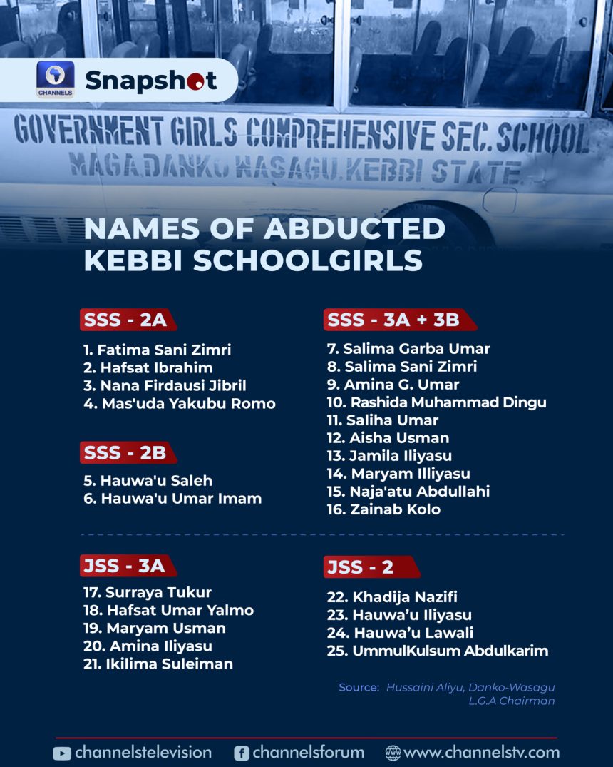 Hussaini Aliyu, chairman of Danko/Wasagu LGA in Kebbi, has released names of the 25 schoolgirls abducted by bandits from the Government Girls Comprehensive Secondary School, Maga.