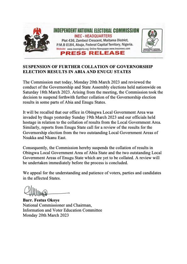 “Consequently, the Commission hereby suspends the collation of results in Obingwa Local Government Area of Abia State and the two outstanding Local Government Areas of Enugu State which are yet to be collated. A review will be undertaken immediately before the process is concluded.