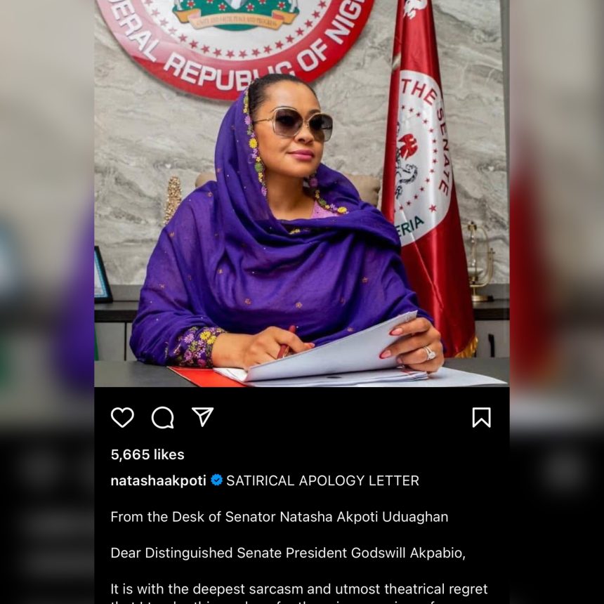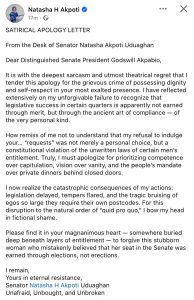 Natasha writes apology letter to Akpabio