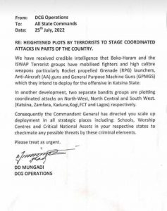 The statement is directed to all State Command of the DCG Operations. It added that the Agency has received a report of heightened plot by ISWAP to stage coordinated attacks on parts of the country mobilising fighters and high calibre weapons.