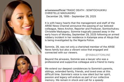 Arise News Channel has announced the death of its journalist, Somtochukwu Maduagwu, who was killed during an armed robbery at her residence in the Katampe area of Abuja on Monday,…